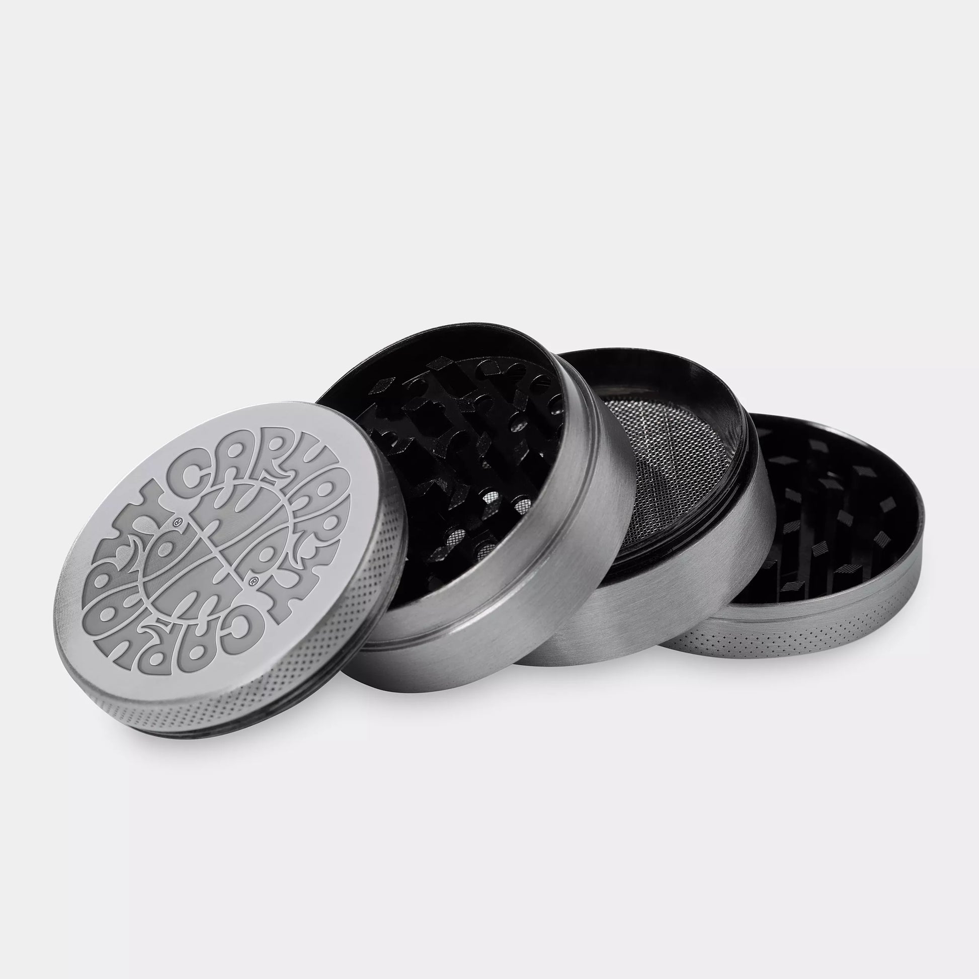 Il Jazzy Grinder è realizzato in lega di zinco ed è composto da quattro scomparti, dei quali uno con filtro a maglia fine. L’articolo presenta una grafica incisa sulla superficie e un logo realizzato al laser sulla base.