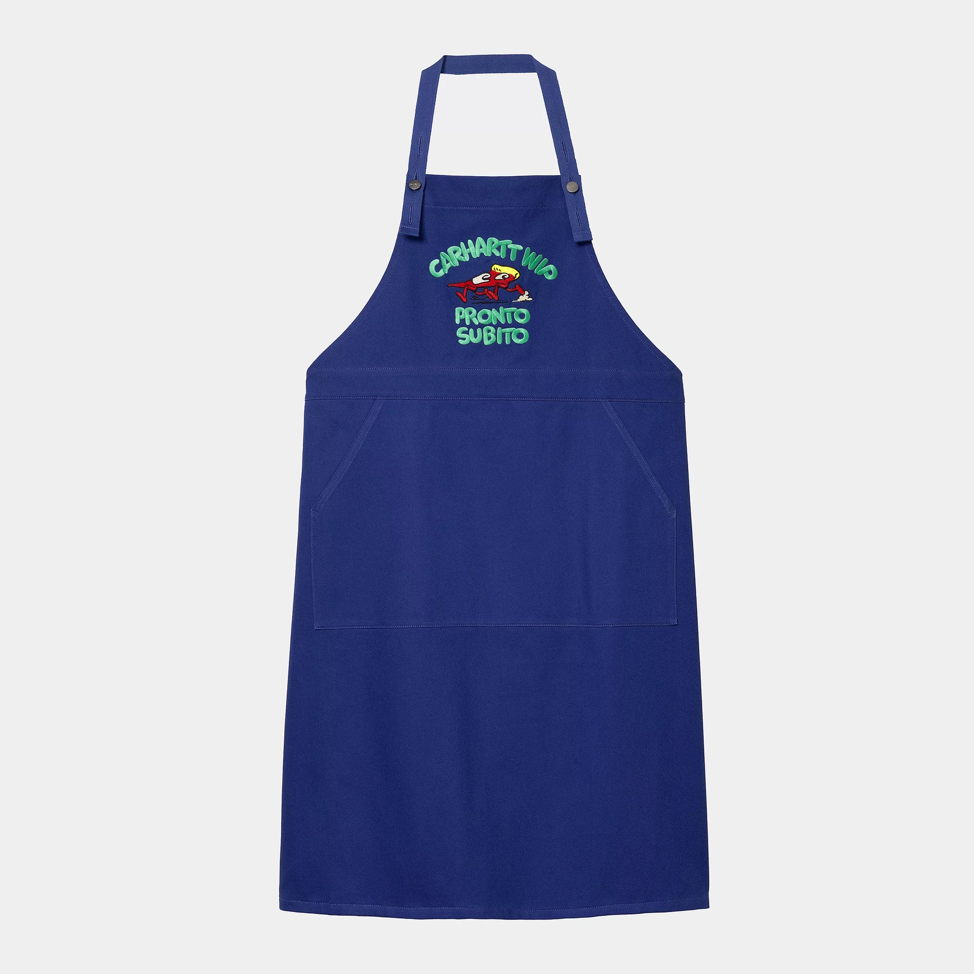 Il Pronto Apron è realizzato in pesante twill di cotone e presenta bretelle in tessuto impreziosite da bottoni in metallo e una tasca a marsupio. Sul davanti è impreziosita da un ricamo grafico.